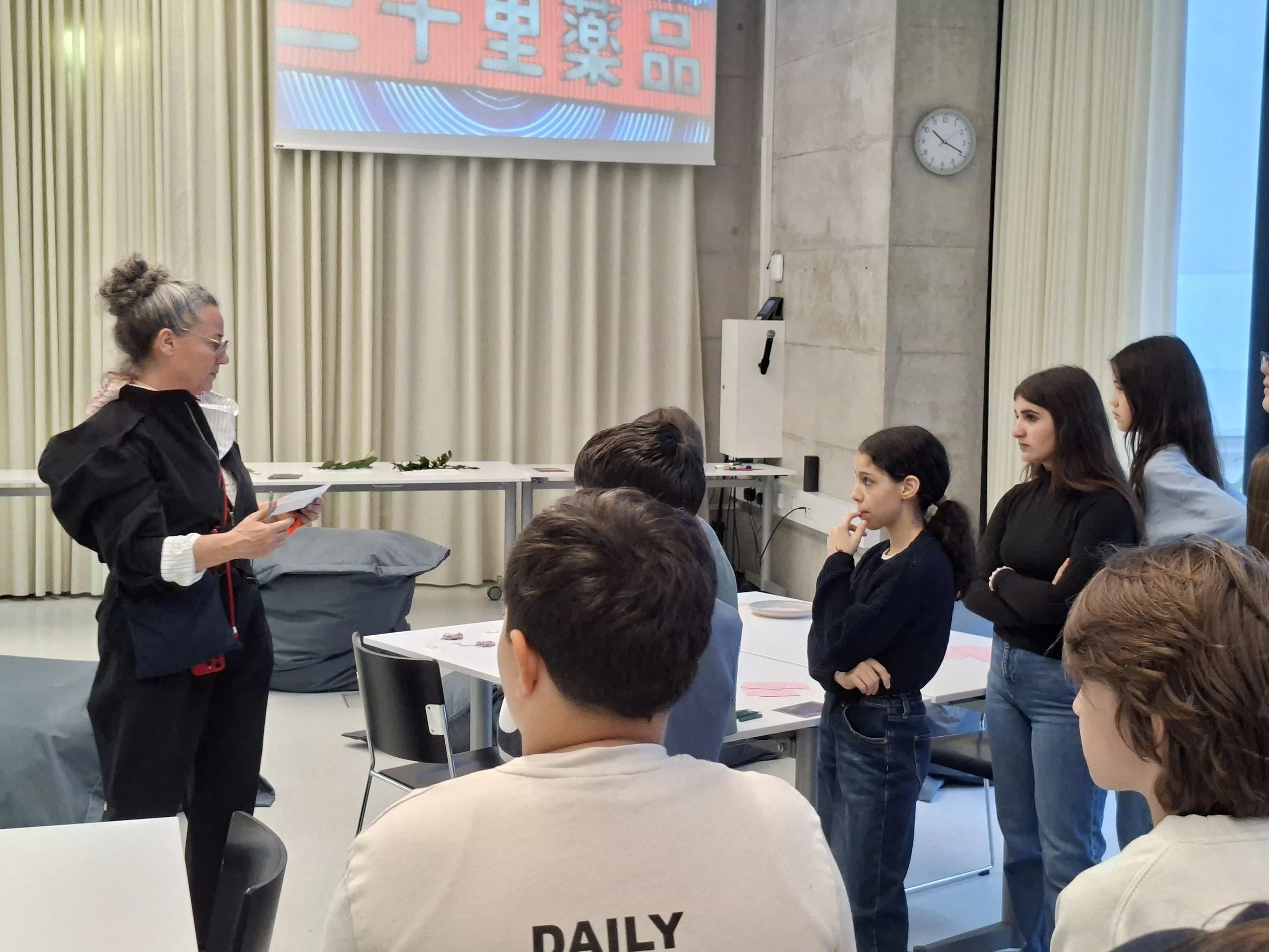 Schüler*innen der MS Stromstraße beim Raum für Nachhaltigkeit auf der Angewandten. Interessierte, potentielle junge Künstler*innen und Designvermittler*innen hören Prof.in Miki Martinek und den Studierenden bei ihren Projektpräsentationen zum Thema “Japanese asthetics” zu.(:-). Foto ©Corona Gsteu