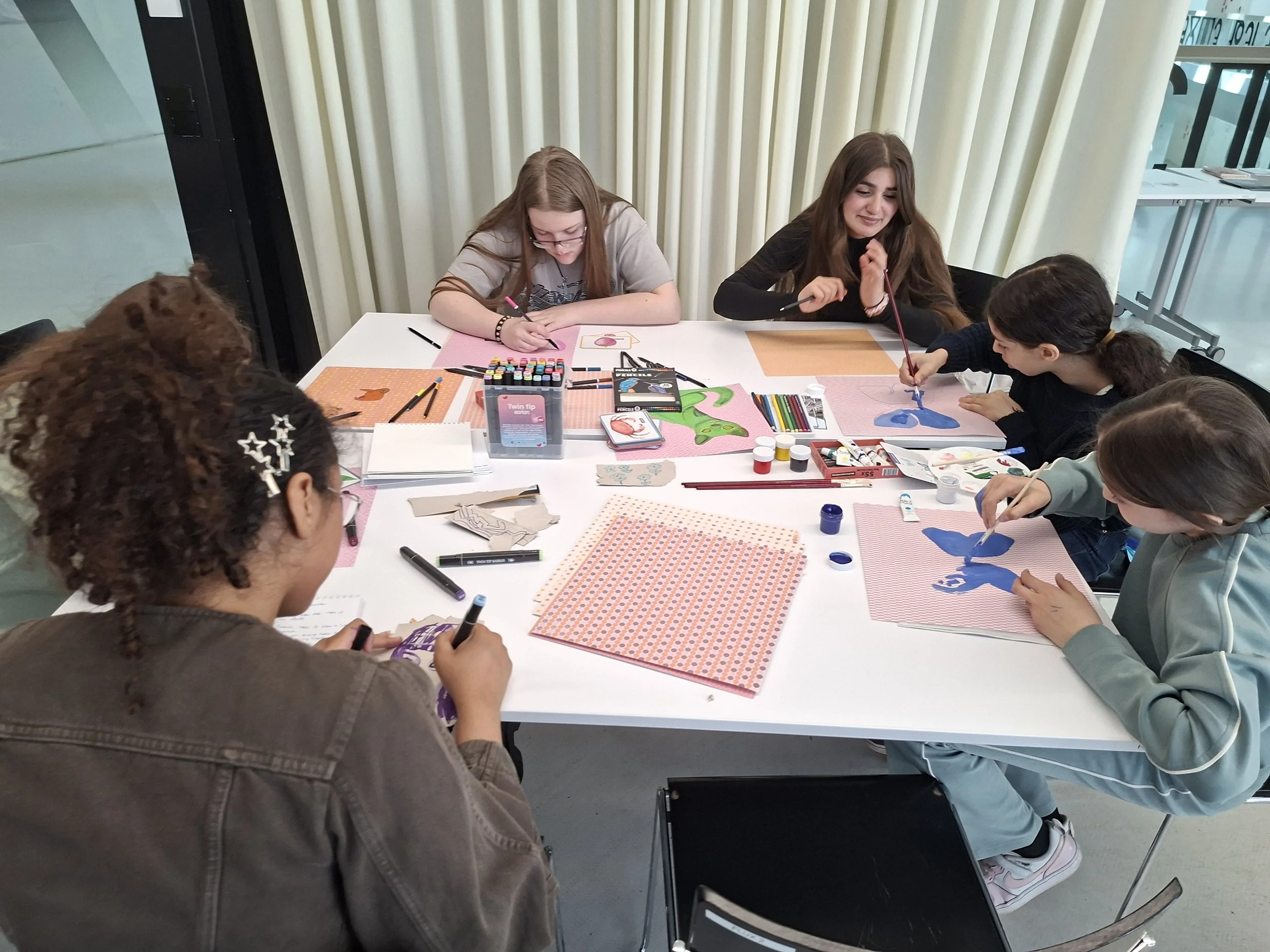 Schüler*innen der MS Stromstraße beim Raum für Nachhaltigkeit auf der Angewandten, junge Künstler*innen und Designvermittler*innen bei der Arbeit(:-). Foto ©Corona Gsteu