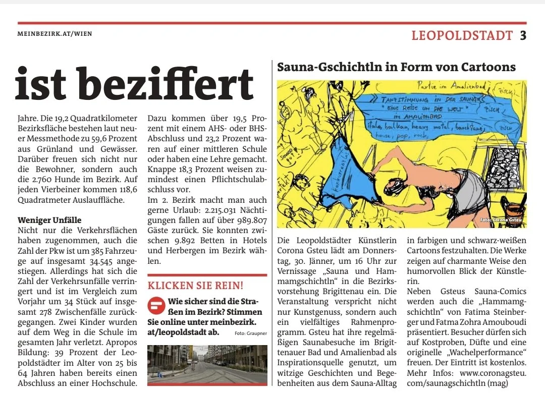 Artikel von Kathrin Klemm 19.1.2023 https://www.meinbezirk.at/leopoldstadt/c-freizeit/cartoons-zum-sauna-alltag-im-gbstadtteilbuero-wien-mitte_a5817601#gallery=null